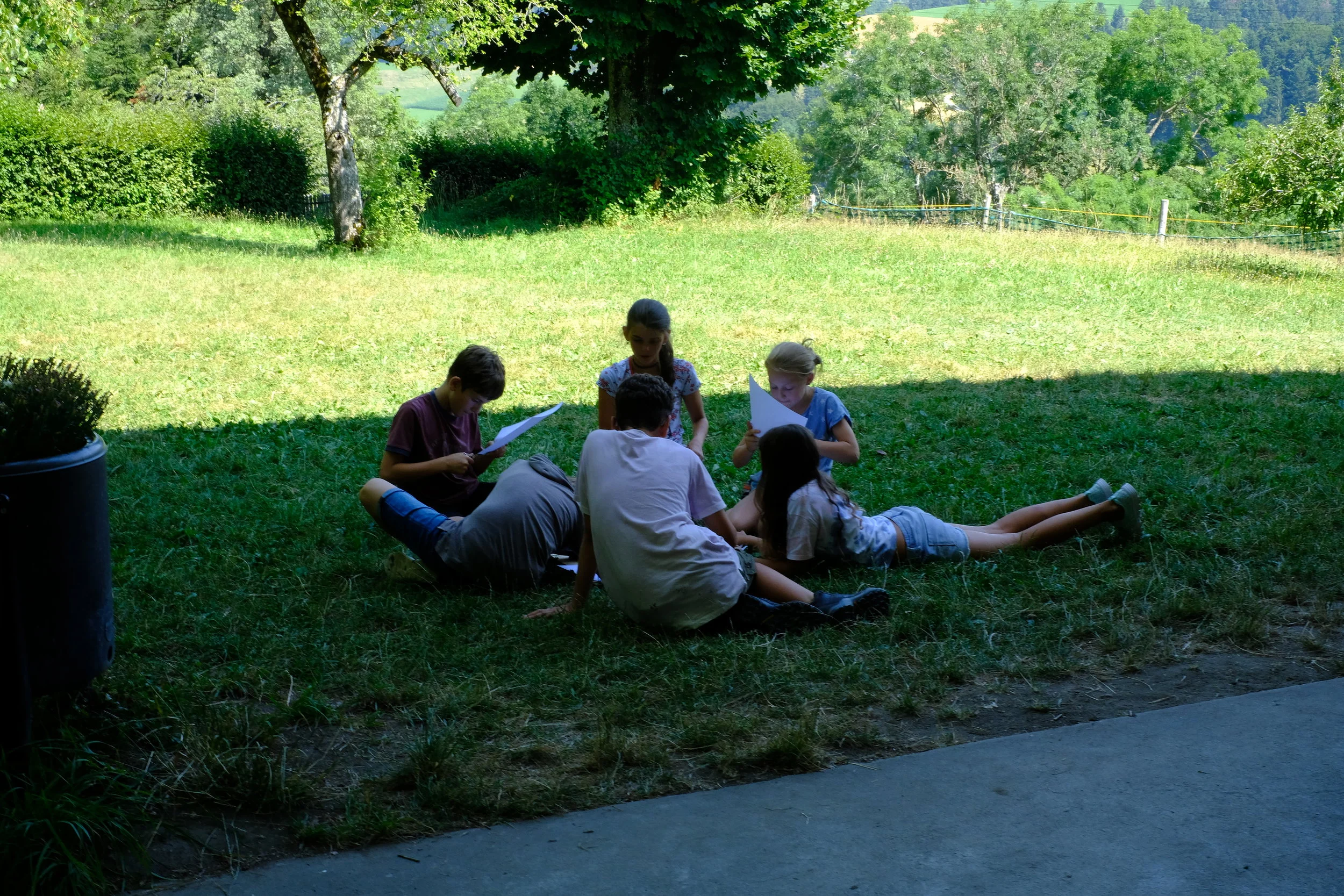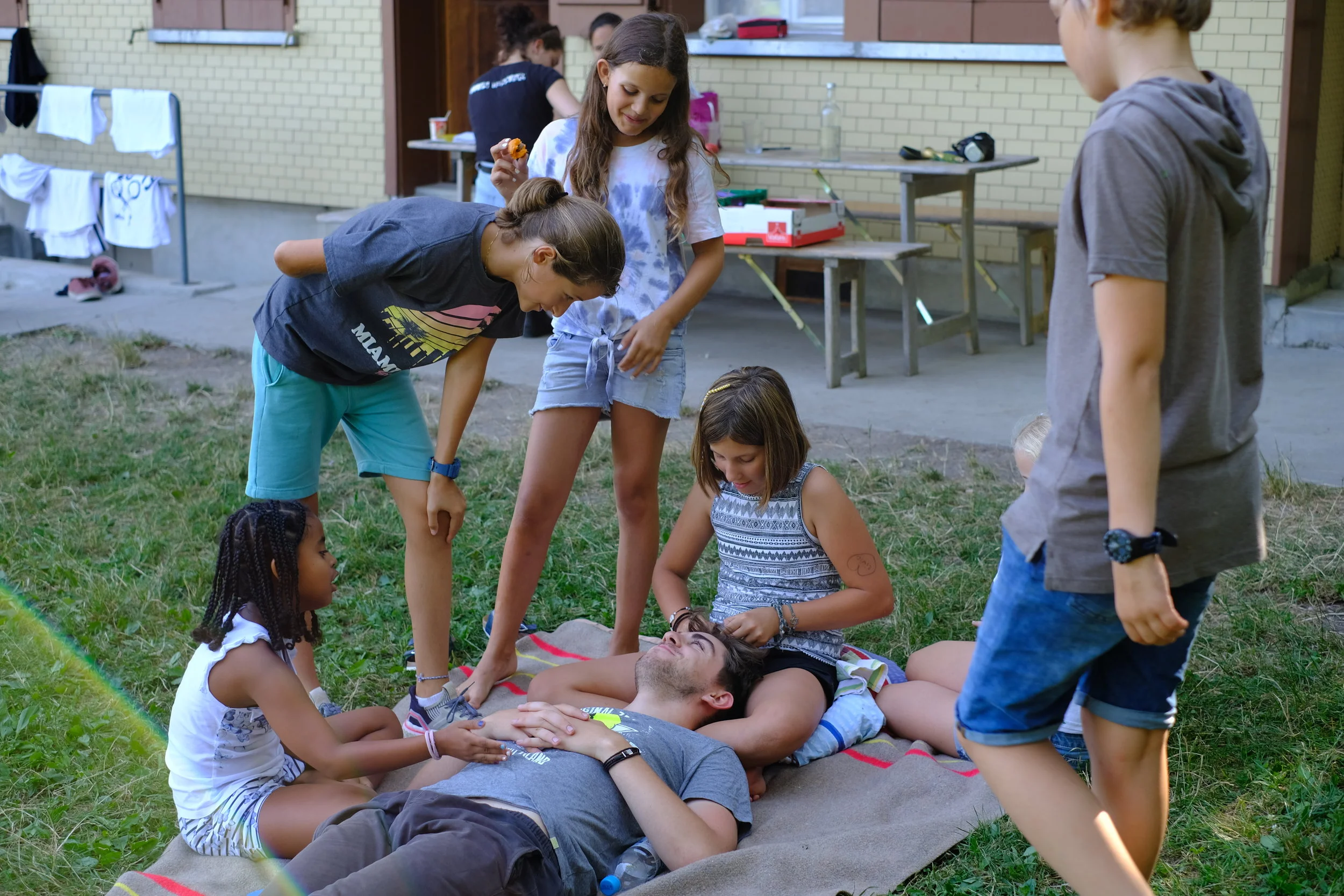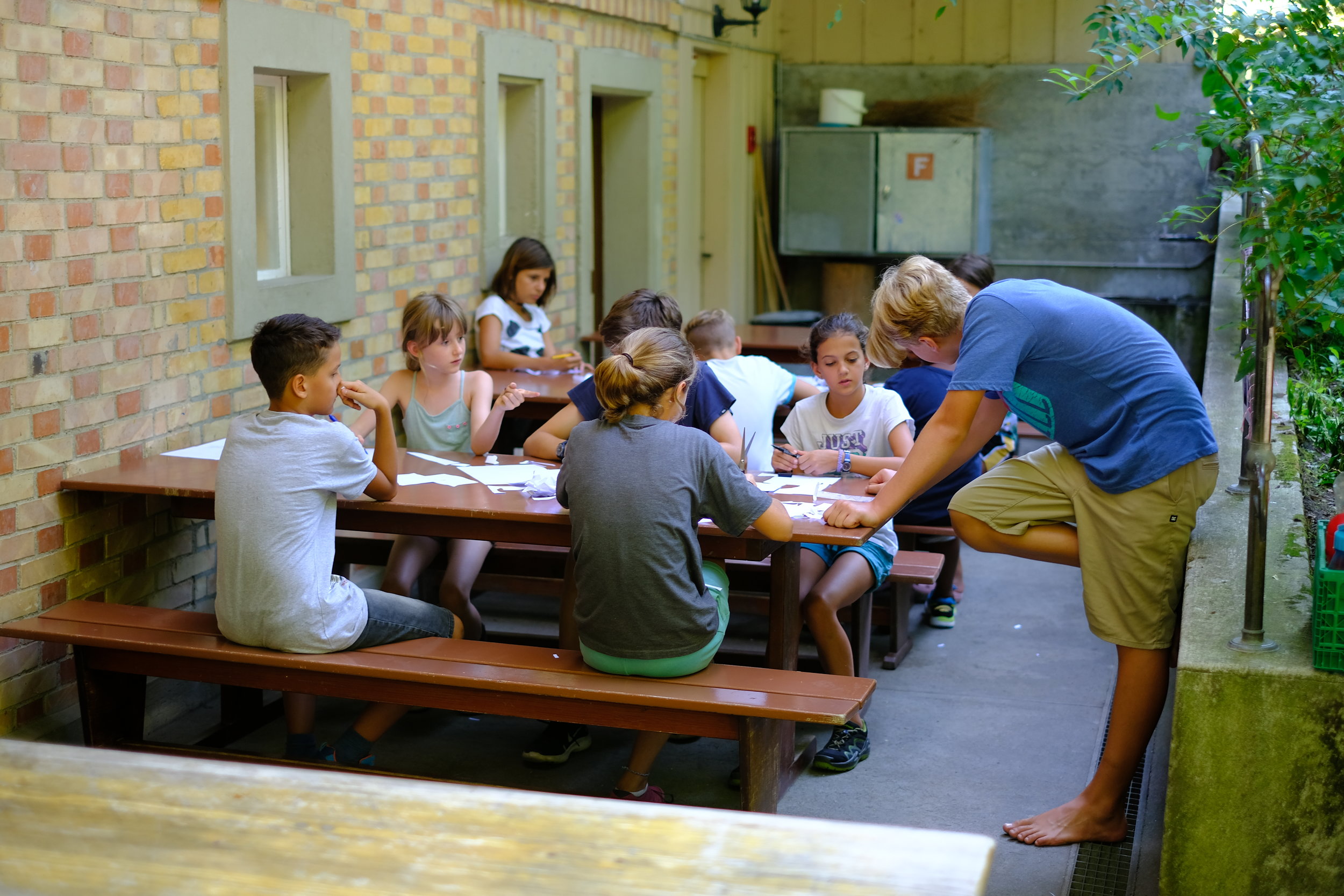 Wir wurden um 8:00 Uhr geweckt. Ca. um 8:15 Uhr gab es Frühstück danach machten wir unsere Ämtli dann hatten wir Freizeit. Wir spielten Fussball, ruhten uns im Zimmer aus und lagen mit Decken auf der Wiese. Bei den Ateliers konnten wir Waldspiele spielen, T-Shirts bemalen oder Bänder knüpfen. Zum Mittagessen gab es Curryreis. Nach dem Mittagessen trafen wir eine Inderin die uns einen Schatzdetektor anbot. Um diesen zu bekommen mussten in den Ämtligruppen Nägel bauen und die auf dem Schwarzmarkt versteigern. Dann hatten wir wieder Freizeit. Zum Abendessen gab es Ofengemüse und übriggebliebener Curryreis. Danach spielten wir noch ein bisschen auf der Wiese oder auf dem Fussballplatz. Nachher werden wir in den Wald singen gehen. Um ca. 10:30 werden wir im Bett sein (hoffentlich).